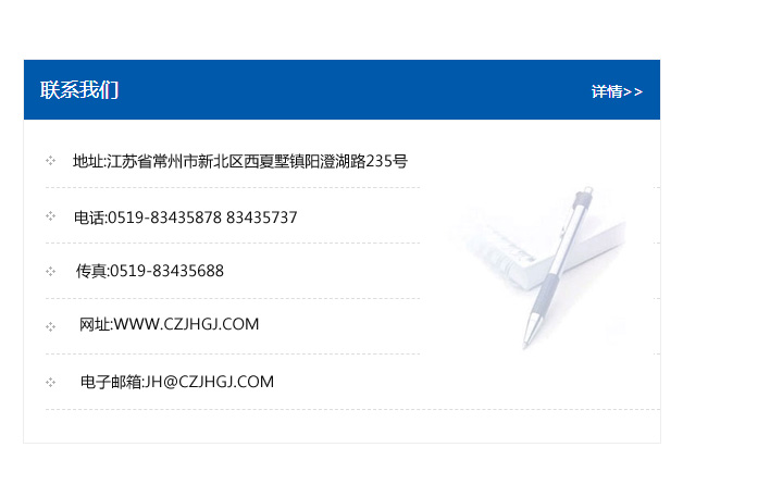 傳真:0519-83435688    郵編:213135    網址:WWW.czjhgj_com.sh-ganghao.com    電子郵箱:JH@czjhgj_com.sh-ganghao.com